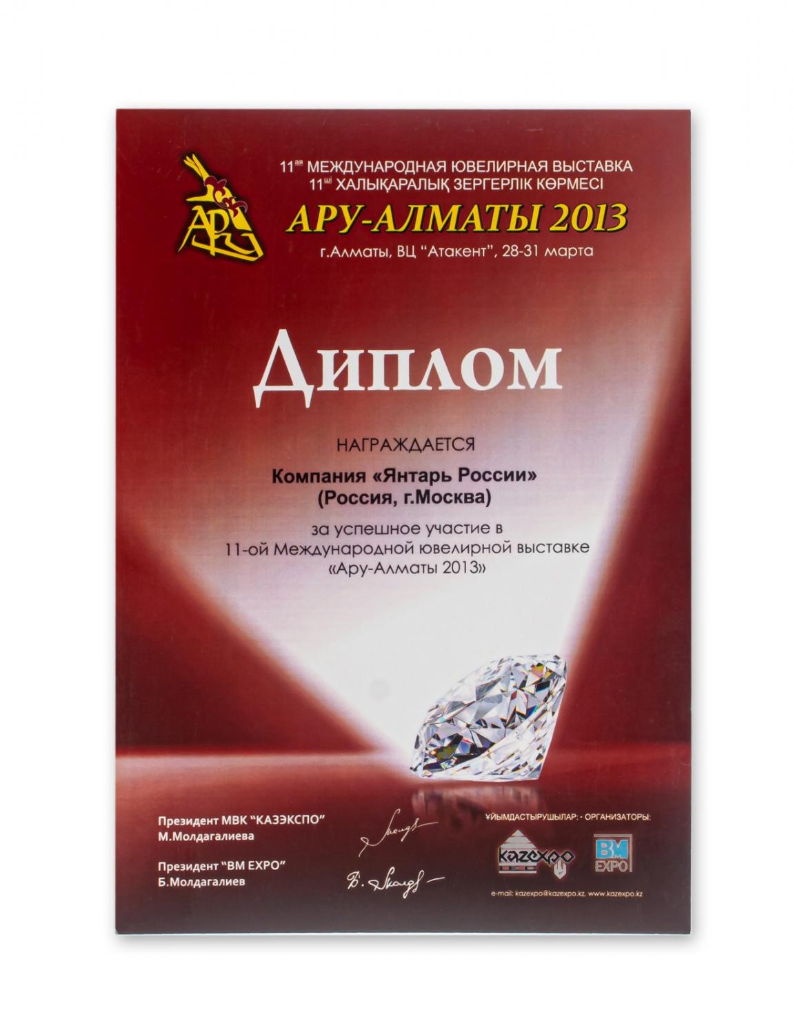 Диплом за успешное участие в 11-ой Международной ювелирной выставке "Ару-Алматы 2013"