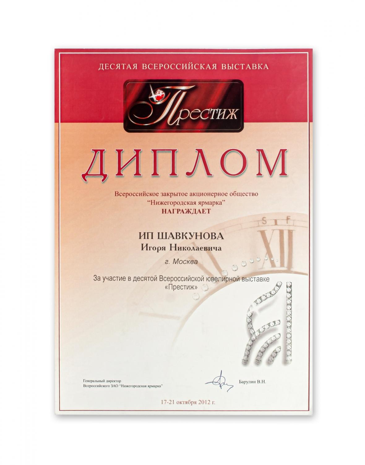 Диплом за участие в десятой Всероссийской ювелирной выставке "Престиж"