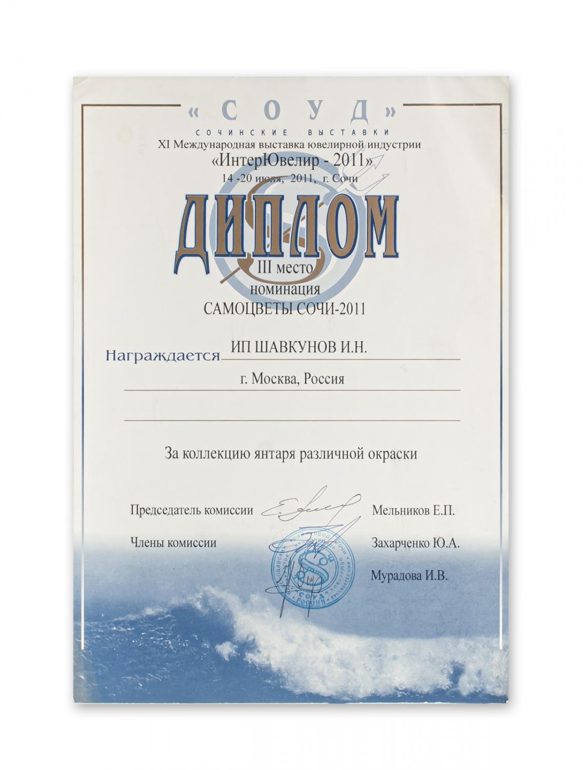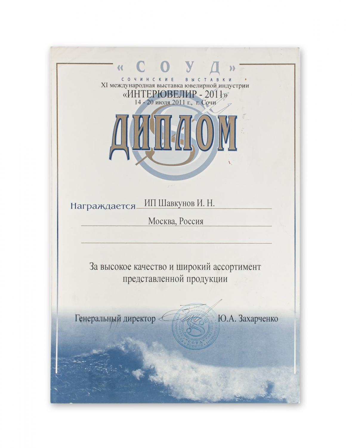 Диплом за активное участие в работе Московской международной выставке "Ювелир-2" (2010 г.)