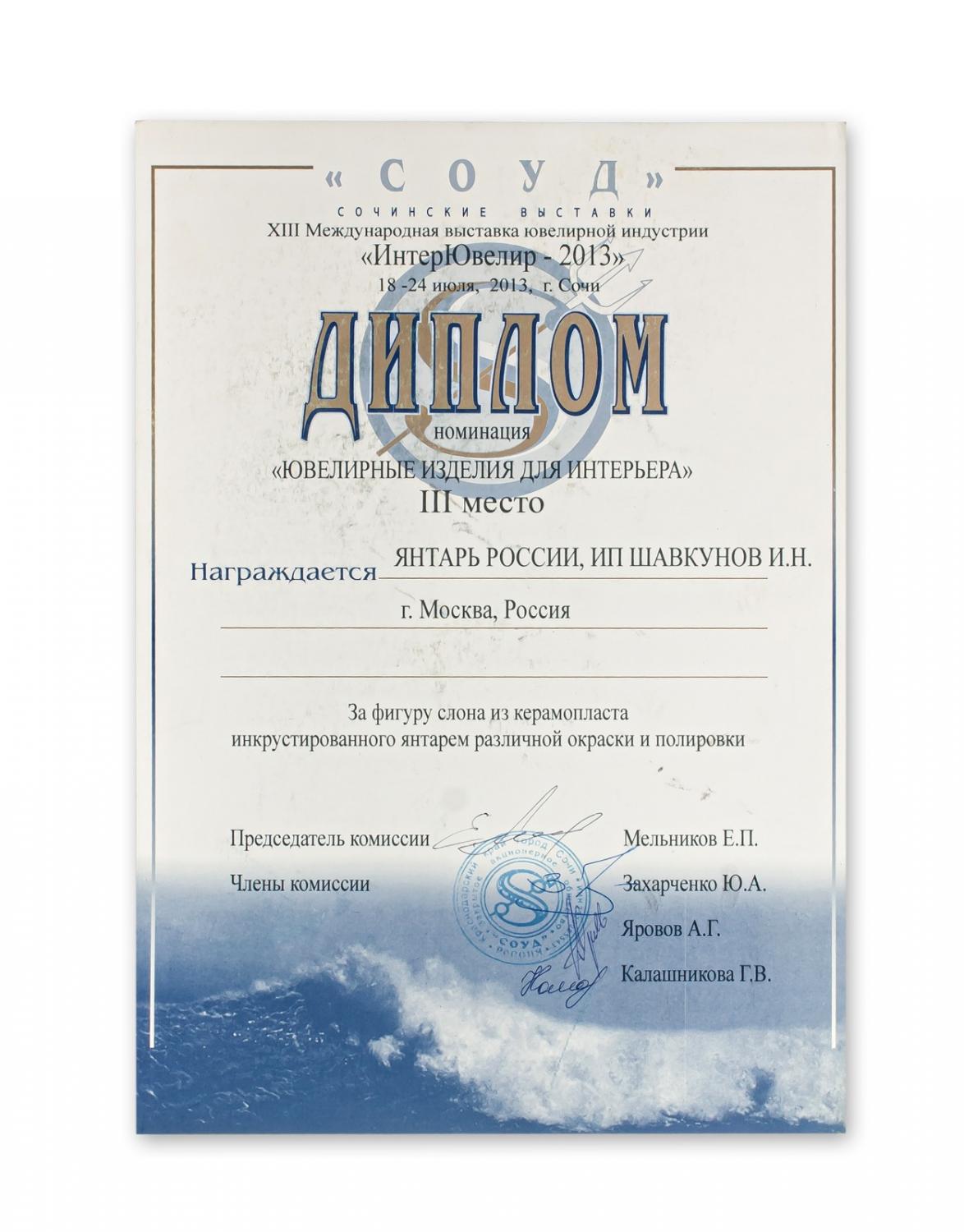 Диплом за изделие "Морская черепаха" из медового и королевского янтаря