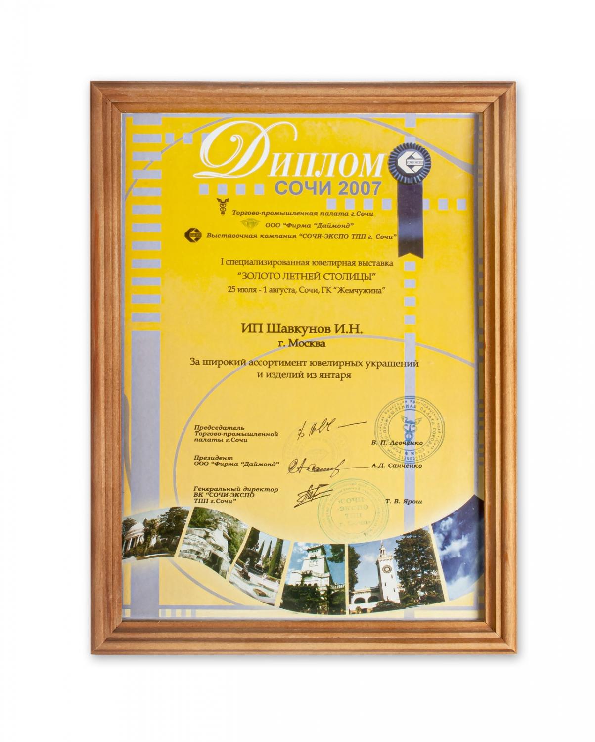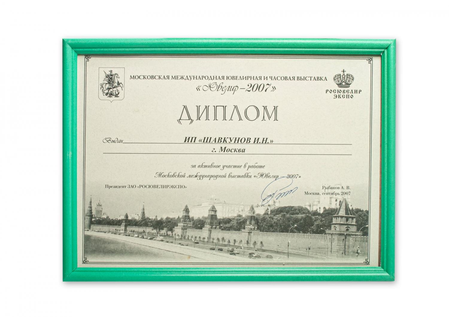 Диплом за активное участие в работе Московской международной выставке "Ювелир-2007"