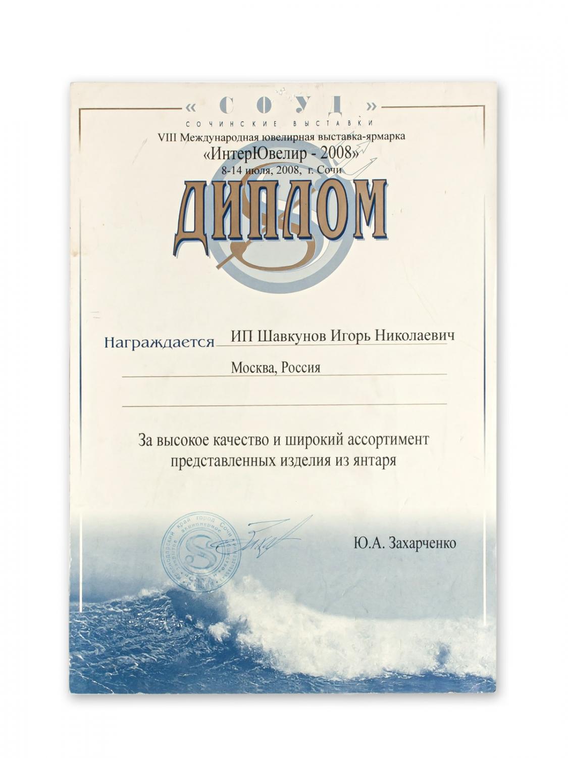 Диплом за активное участие в работе Московской международной выставке "Ювелир-2008"