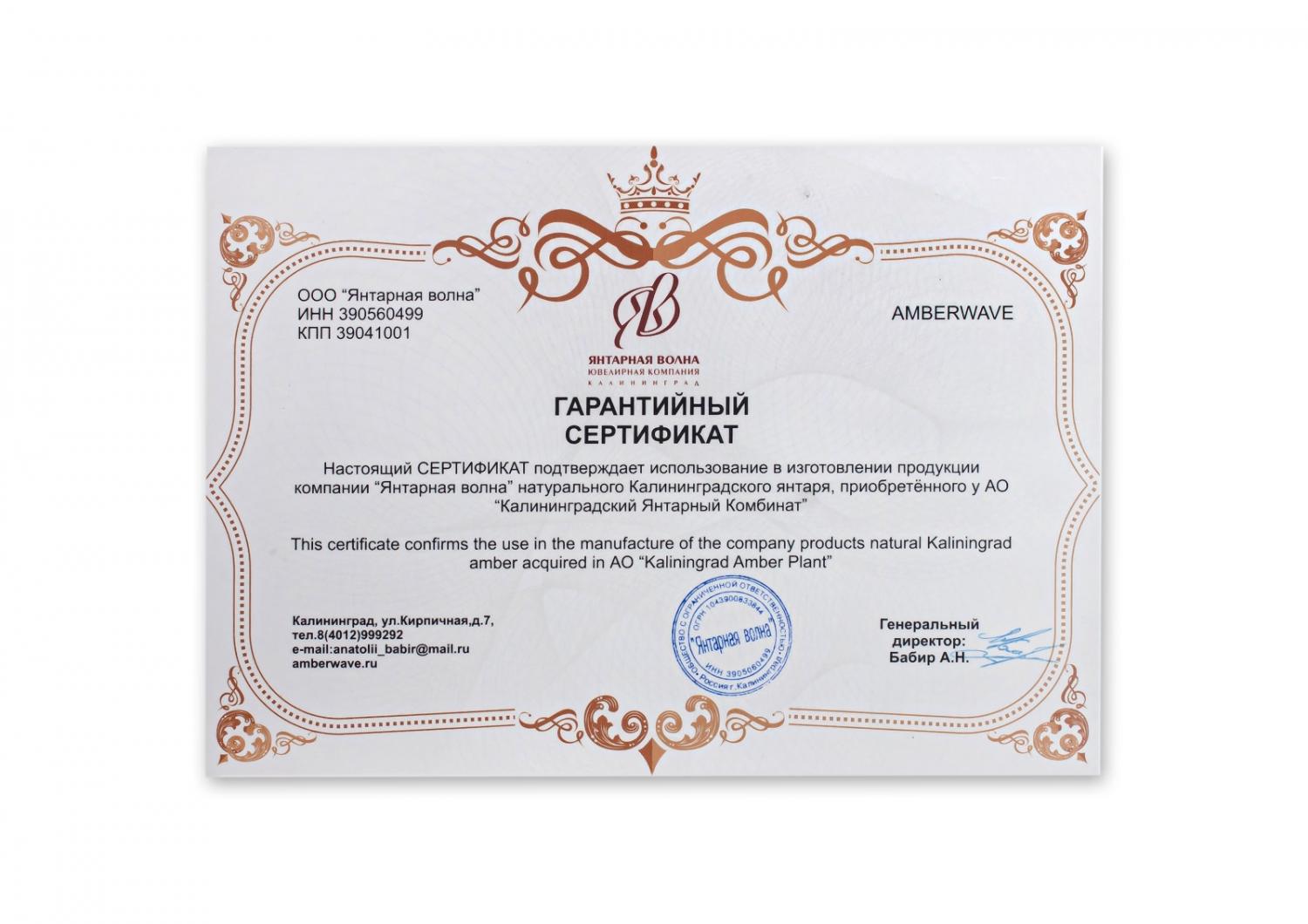 Гарантийный сертификат подтверждающий что изделия изготовлены из натурального Калининградского янтаря